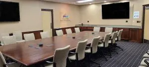This intimate space is ideal for small business meetings. This 20 x 28 windowed room can comfortably accommodate up to 22 individuals around a large rectangle table in comfortable, business chairs.