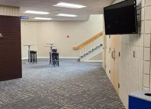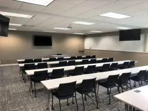 Depending upon the configuration selected the Meeting Room can seat up to 40 people classroom style (or more if theater style – without tables):